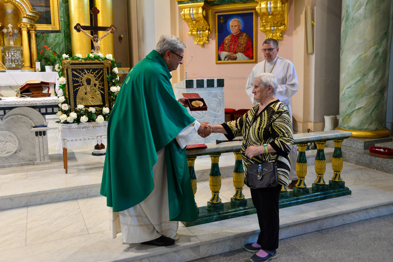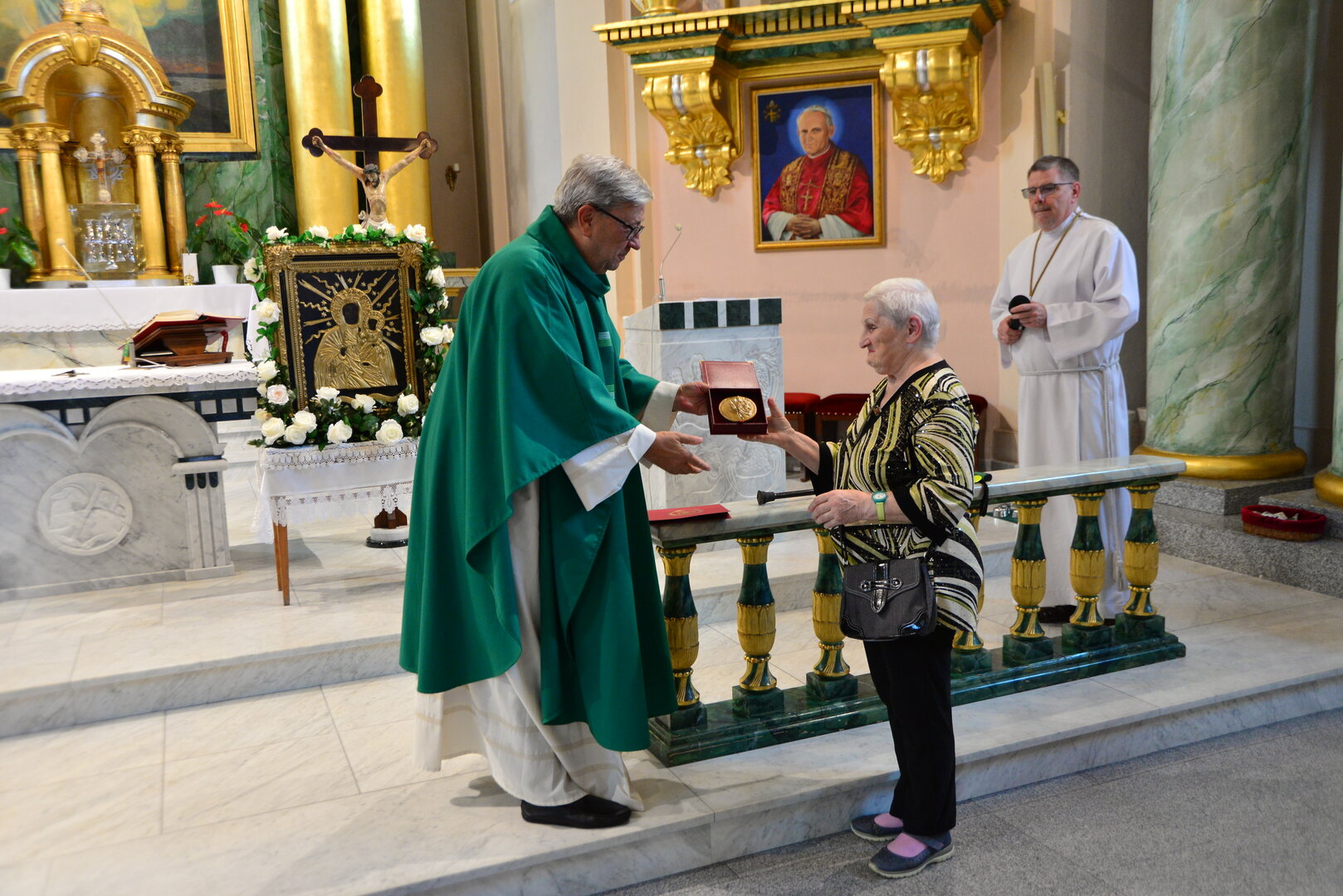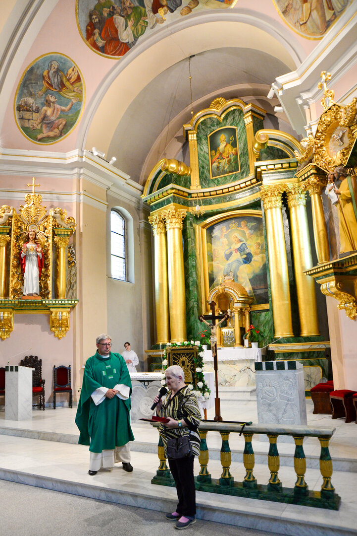 Medal w imieniu ks. Biskupa, Pani Aleksandrze, wręczył Proboszcz parafii, ks. kanonik Karol Glesmer.