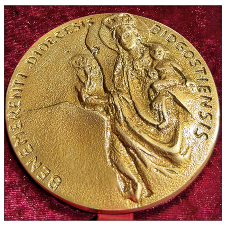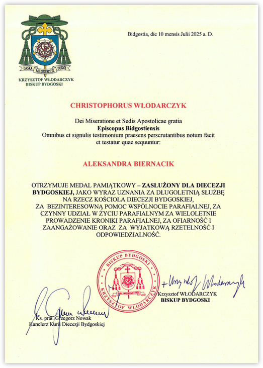 jako wyraz uznania za długoletnią służbę na rzecz Kościoła Diecezji Bydgoskiej, za bezinteresowną pomoc wspólnocie parafialnej, za czynny udział w życiu parafialnym, za wieloletnie prowadzenie Kroniki Parafialnej, za ofiarność i zaangażowanie oraz za wyjątkową rzetelność i odpowiedzialność.